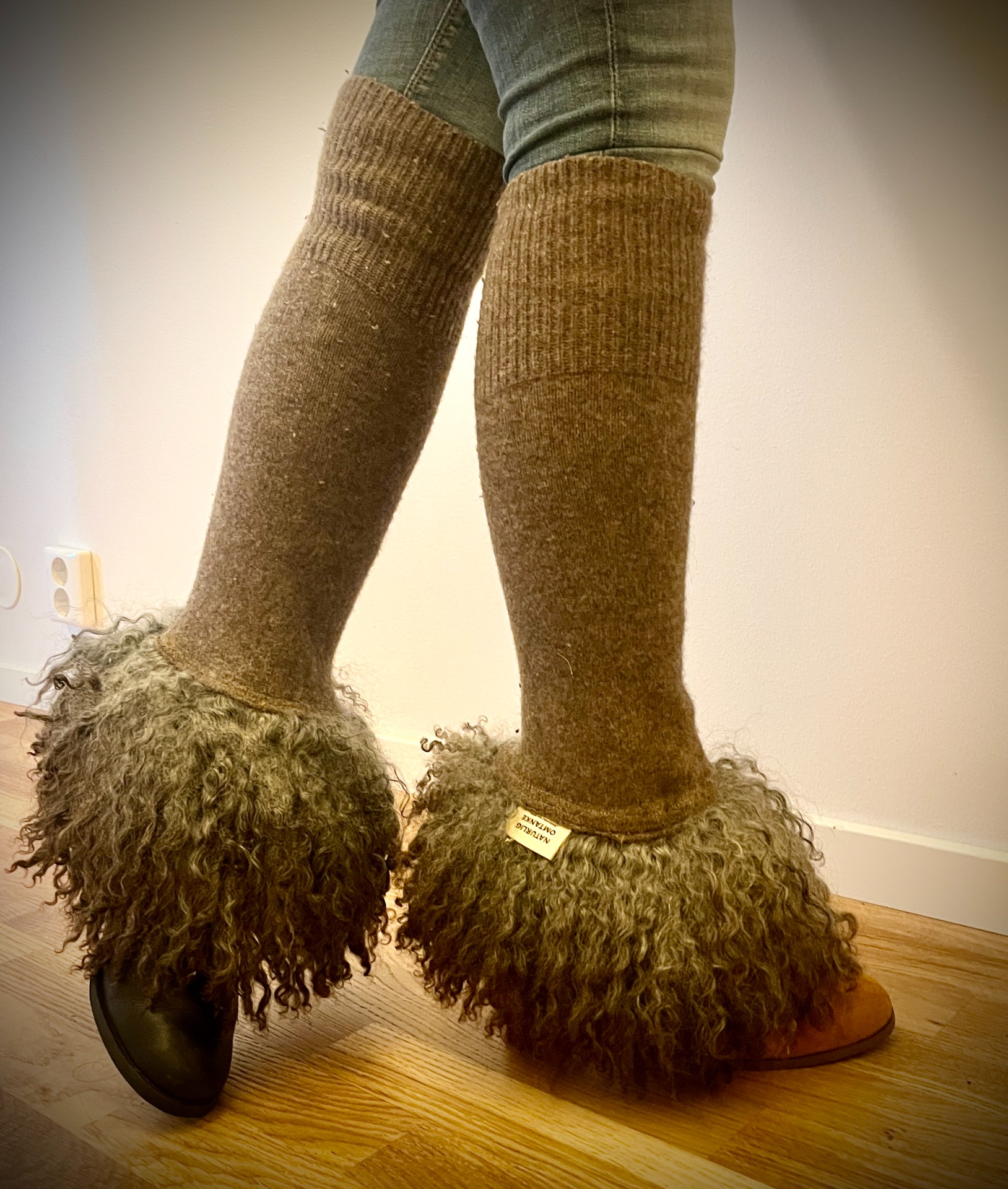 Höga benvärmare i mjuk merinoull med detaljer i Gotlandsskinn – både varma och stilfulla.